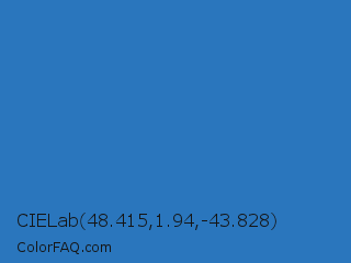 CIELab 48.415,1.94,-43.828 Color is a normal blue color and the nearest color is Mariner #286acd. Hex code #2a76bd and RGB value is rgb(42,118,189). In RGB color space, this color is composed of 16% red, 46% green, 74% blue, In CMYK color space, this color is composed of 78% cyan, 38% magenta, 0% yellow , 26% black , In HSL color space, this color has a hue angle of 209° , 64% saturation and 45% lightness.