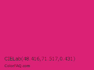 CIELab 48.416,71.517,0.431 Color is a normal rose color and the nearest color is Vivid Cerise #da1d81. Hex code #d92175 and RGB value is rgb(217,33,117). In RGB color space, this color is composed of 85% red, 13% green, 46% blue, In CMYK color space, this color is composed of 0% cyan, 85% magenta, 46% yellow , 15% black , In HSL color space, this color has a hue angle of 333° , 74% saturation and 49% lightness.