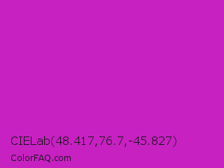 CIELab 48.417,76.7,-45.827 Color is a normal magenta color and the nearest color is Steel Pink #cc33cc. Hex code #c721c2 and RGB value is rgb(199,33,194). In RGB color space, this color is composed of 78% red, 13% green, 76% blue, In CMYK color space, this color is composed of 0% cyan, 83% magenta, 3% yellow , 22% black , In HSL color space, this color has a hue angle of 302° , 72% saturation and 45% lightness.