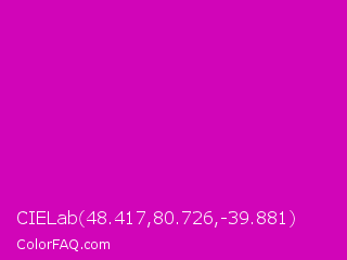 CIELab 48.417,80.726,-39.881 Color is a normal magenta color and the nearest color is Deep Magenta #cc00cc. Hex code #d105b8 and RGB value is rgb(209,5,184). In RGB color space, this color is composed of 82% red, 2% green, 72% blue, In CMYK color space, this color is composed of 0% cyan, 98% magenta, 12% yellow , 18% black , In HSL color space, this color has a hue angle of 307° , 95% saturation and 42% lightness.