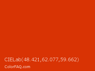 CIELab 48.421,62.077,59.662 Color is a normal red color and the nearest color is Grenadier #d54600. Hex code #d93304 and RGB value is rgb(217,51,4). In RGB color space, this color is composed of 85% red, 20% green, 2% blue, In CMYK color space, this color is composed of 0% cyan, 76% magenta, 98% yellow , 15% black , In HSL color space, this color has a hue angle of 13° , 96% saturation and 43% lightness.
