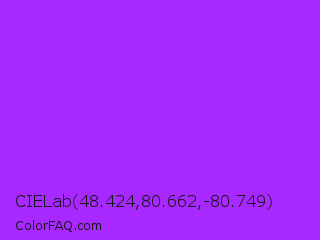 CIELab 48.424,80.662,-80.749 Color is a normal purple color and the nearest color is Veronica #a020f0. Hex code #a829ff and RGB value is rgb(168,41,255). In RGB color space, this color is composed of 66% red, 16% green, 100% blue, In CMYK color space, this color is composed of 34% cyan, 84% magenta, 0% yellow , 0% black , In HSL color space, this color has a hue angle of 276° , 100% saturation and 58% lightness.