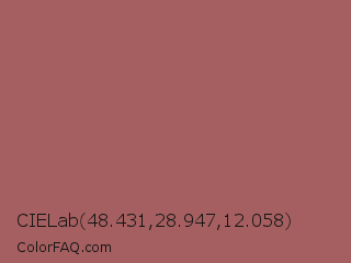 CIELab 48.431,28.947,12.058 Color is a normal red color and the nearest color is Deep Puce #a95c68. Hex code #a65f60 and RGB value is rgb(166,95,96). In RGB color space, this color is composed of 65% red, 37% green, 38% blue, In CMYK color space, this color is composed of 0% cyan, 43% magenta, 42% yellow , 35% black , In HSL color space, this color has a hue angle of 359° , 29% saturation and 51% lightness.