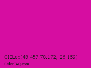CIELab 48.457,78.172,-26.159 Color is a normal magenta color and the nearest color is Barbie Pink #e0218a. Hex code #d60da1 and RGB value is rgb(214,13,161). In RGB color space, this color is composed of 84% red, 5% green, 63% blue, In CMYK color space, this color is composed of 0% cyan, 94% magenta, 25% yellow , 16% black , In HSL color space, this color has a hue angle of 316° , 89% saturation and 45% lightness.