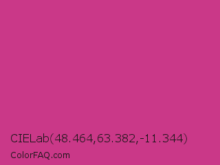 CIELab 48.464,63.382,-11.344 Color is a normal magenta color and the nearest color is Magenta Pink #cc338b. Hex code #ca3888 and RGB value is rgb(202,56,136). In RGB color space, this color is composed of 79% red, 22% green, 53% blue, In CMYK color space, this color is composed of 0% cyan, 72% magenta, 33% yellow , 21% black , In HSL color space, this color has a hue angle of 327° , 58% saturation and 51% lightness.