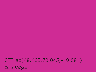 CIELab 48.465,70.045,-19.081 Color is a normal magenta color and the nearest color is Royal Fuchsia #ca2c92. Hex code #cf2b95 and RGB value is rgb(207,43,149). In RGB color space, this color is composed of 81% red, 17% green, 58% blue, In CMYK color space, this color is composed of 0% cyan, 79% magenta, 28% yellow , 19% black , In HSL color space, this color has a hue angle of 321° , 66% saturation and 49% lightness.