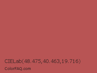 CIELab 48.475,40.463,19.716 Color is a normal red color and the nearest color is Bittersweet Shimmer #bf4f51. Hex code #b85454 and RGB value is rgb(184,84,84). In RGB color space, this color is composed of 72% red, 33% green, 33% blue, In CMYK color space, this color is composed of 0% cyan, 54% magenta, 54% yellow , 28% black , In HSL color space, this color has a hue angle of 0° , 41% saturation and 53% lightness.