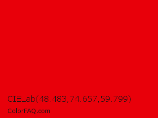 CIELab 48.483,74.657,59.799 Color is a normal red color and the nearest color is KU Crimson #e8000d. Hex code #e8000a and RGB value is rgb(232,0,10). In RGB color space, this color is composed of 91% red, 0% green, 4% blue, In CMYK color space, this color is composed of 0% cyan, 100% magenta, 96% yellow , 9% black , In HSL color space, this color has a hue angle of 357° , 100% saturation and 45% lightness.