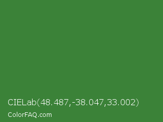 CIELab 48.487,-38.047,33.002 Color is a normal green color and the nearest color is Fern Green #4f7942. Hex code #3b8238 and RGB value is rgb(59,130,56). In RGB color space, this color is composed of 23% red, 51% green, 22% blue, In CMYK color space, this color is composed of 55% cyan, 0% magenta, 57% yellow , 49% black , In HSL color space, this color has a hue angle of 118° , 40% saturation and 36% lightness.