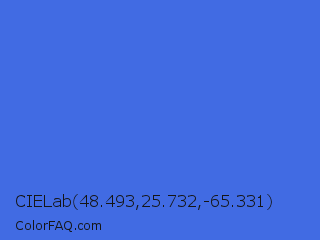 CIELab 48.493,25.732,-65.331 Color is a normal blue color and the nearest color is Royal Blue #4169e1. Hex code #416be3 and RGB value is rgb(65,107,227). In RGB color space, this color is composed of 25% red, 42% green, 89% blue, In CMYK color space, this color is composed of 71% cyan, 53% magenta, 0% yellow , 11% black , In HSL color space, this color has a hue angle of 224° , 74% saturation and 57% lightness.