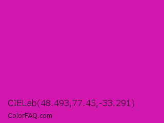 CIELab 48.493,77.45,-33.291 Color is a normal magenta color and the nearest color is Royal Fuchsia #ca2c92. Hex code #d117ad and RGB value is rgb(209,23,173). In RGB color space, this color is composed of 82% red, 9% green, 68% blue, In CMYK color space, this color is composed of 0% cyan, 89% magenta, 17% yellow , 18% black , In HSL color space, this color has a hue angle of 312° , 80% saturation and 45% lightness.