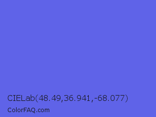 CIELab 48.49,36.941,-68.077 Color is a light blue color and the nearest color is Majorelle Blue #6050dc. Hex code #5f63e8 and RGB value is rgb(95,99,232). In RGB color space, this color is composed of 37% red, 39% green, 91% blue, In CMYK color space, this color is composed of 59% cyan, 57% magenta, 0% yellow , 9% black , In HSL color space, this color has a hue angle of 238° , 75% saturation and 64% lightness.