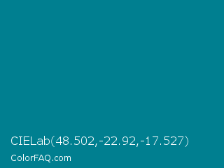 CIELab 48.502,-22.92,-17.527 Color is a dark cyan color and the nearest color is Metallic Seaweed #0a7e8c. Hex code #007f90 and RGB value is rgb(0,127,144). In RGB color space, this color is composed of 0% red, 50% green, 56% blue, In CMYK color space, this color is composed of 100% cyan, 12% magenta, 0% yellow , 44% black , In HSL color space, this color has a hue angle of 187° , 100% saturation and 28% lightness.