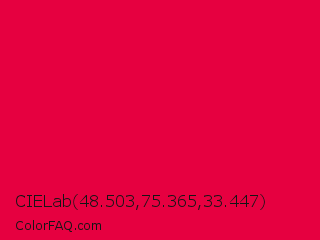 CIELab 48.503,75.365,33.447 Color is a normal rose color and the nearest color is Red Ribbon #ed0a3f. Hex code #e60040 and RGB value is rgb(230,0,64). In RGB color space, this color is composed of 90% red, 0% green, 25% blue, In CMYK color space, this color is composed of 0% cyan, 100% magenta, 72% yellow , 10% black , In HSL color space, this color has a hue angle of 343° , 100% saturation and 45% lightness.
