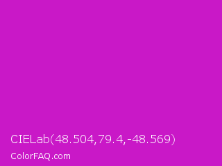 CIELab 48.504,79.4,-48.569 Color is a normal magenta color and the nearest color is Deep Magenta #cc00cc. Hex code #c918c7 and RGB value is rgb(201,24,199). In RGB color space, this color is composed of 79% red, 9% green, 78% blue, In CMYK color space, this color is composed of 0% cyan, 88% magenta, 1% yellow , 21% black , In HSL color space, this color has a hue angle of 301° , 79% saturation and 44% lightness.
