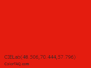CIELab 48.506,70.444,57.796 Color is a normal red color and the nearest color is Lust #e62020. Hex code #e31c0f and RGB value is rgb(227,28,15). In RGB color space, this color is composed of 89% red, 11% green, 6% blue, In CMYK color space, this color is composed of 0% cyan, 88% magenta, 93% yellow , 11% black , In HSL color space, this color has a hue angle of 4° , 88% saturation and 47% lightness.