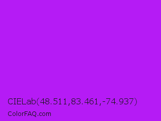 CIELab 48.511,83.461,-74.937 Color is a normal purple color and the nearest color is Veronica #a020f0. Hex code #b51bf5 and RGB value is rgb(181,27,245). In RGB color space, this color is composed of 71% red, 11% green, 96% blue, In CMYK color space, this color is composed of 26% cyan, 89% magenta, 0% yellow , 4% black , In HSL color space, this color has a hue angle of 282° , 92% saturation and 53% lightness.