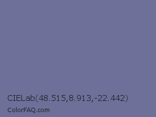 CIELab 48.515,8.913,-22.442 Color is a normal blue color and the nearest color is Kimberly #736c9f. Hex code #6e7099 and RGB value is rgb(110,112,153). In RGB color space, this color is composed of 43% red, 44% green, 60% blue, In CMYK color space, this color is composed of 28% cyan, 27% magenta, 0% yellow , 40% black , In HSL color space, this color has a hue angle of 237° , 17% saturation and 52% lightness.