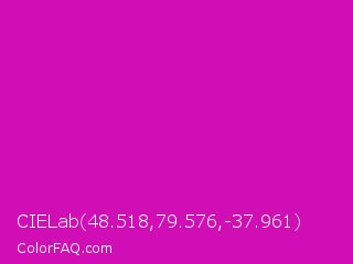 CIELab 48.518,79.576,-37.961 Color is a normal magenta color and the nearest color is Deep Magenta #cc00cc. Hex code #d10eb5 and RGB value is rgb(209,14,181). In RGB color space, this color is composed of 82% red, 5% green, 71% blue, In CMYK color space, this color is composed of 0% cyan, 93% magenta, 13% yellow , 18% black , In HSL color space, this color has a hue angle of 309° , 87% saturation and 44% lightness.