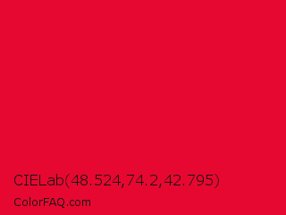 CIELab 48.524,74.2,42.795 Color is a normal red color and the nearest color is Medium Candy Apple Red #e2062c. Hex code #e60830 and RGB value is rgb(230,8,48). In RGB color space, this color is composed of 90% red, 3% green, 19% blue, In CMYK color space, this color is composed of 0% cyan, 97% magenta, 79% yellow , 10% black , In HSL color space, this color has a hue angle of 349° , 93% saturation and 47% lightness.