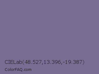 CIELab 48.527,13.396,-19.387 Color is a normal indigo color and the nearest color is Rhythm #777696. Hex code #7a6d94 and RGB value is rgb(122,109,148). In RGB color space, this color is composed of 48% red, 43% green, 58% blue, In CMYK color space, this color is composed of 18% cyan, 26% magenta, 0% yellow , 42% black , In HSL color space, this color has a hue angle of 260° , 15% saturation and 50% lightness.