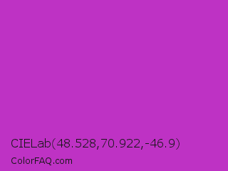 CIELab 48.528,70.922,-46.9 Color is a normal magenta color and the nearest color is Steel Pink #cc33cc. Hex code #be32c4 and RGB value is rgb(190,50,196). In RGB color space, this color is composed of 75% red, 20% green, 77% blue, In CMYK color space, this color is composed of 3% cyan, 74% magenta, 0% yellow , 23% black , In HSL color space, this color has a hue angle of 298° , 59% saturation and 48% lightness.