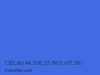 CIELab 48.536,25.863,-65.26 Color is a normal blue color and the nearest color is Royal Blue #4169e1. Hex code #426be3 and RGB value is rgb(66,107,227). In RGB color space, this color is composed of 26% red, 42% green, 89% blue, In CMYK color space, this color is composed of 71% cyan, 53% magenta, 0% yellow , 11% black , In HSL color space, this color has a hue angle of 225° , 74% saturation and 57% lightness.