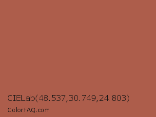 CIELab 48.537,30.749,24.803 Color is a normal red color and the nearest color is Giants Club #b05c52. Hex code #ad5d4b and RGB value is rgb(173,93,75). In RGB color space, this color is composed of 68% red, 36% green, 29% blue, In CMYK color space, this color is composed of 0% cyan, 46% magenta, 57% yellow , 32% black , In HSL color space, this color has a hue angle of 11° , 40% saturation and 49% lightness.