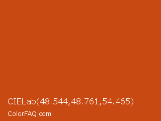 CIELab 48.544,48.761,54.465 Color is a normal orange color and the nearest color is Tia Maria #c1440e. Hex code #c94912 and RGB value is rgb(201,73,18). In RGB color space, this color is composed of 79% red, 29% green, 7% blue, In CMYK color space, this color is composed of 0% cyan, 64% magenta, 91% yellow , 21% black , In HSL color space, this color has a hue angle of 18° , 84% saturation and 43% lightness.