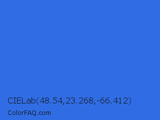 CIELab 48.54,23.268,-66.412 Color is a normal blue color and the nearest color is Royal Blue #4169e1. Hex code #306de5 and RGB value is rgb(48,109,229). In RGB color space, this color is composed of 19% red, 43% green, 90% blue, In CMYK color space, this color is composed of 79% cyan, 52% magenta, 0% yellow , 10% black , In HSL color space, this color has a hue angle of 220° , 78% saturation and 54% lightness.