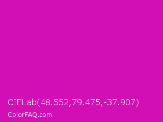 CIELab 48.552,79.475,-37.907 Color is a normal magenta color and the nearest color is Deep Magenta #cc00cc. Hex code #d10fb5 and RGB value is rgb(209,15,181). In RGB color space, this color is composed of 82% red, 6% green, 71% blue, In CMYK color space, this color is composed of 0% cyan, 93% magenta, 13% yellow , 18% black , In HSL color space, this color has a hue angle of 309° , 87% saturation and 44% lightness.