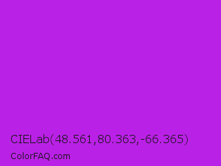 CIELab 48.561,80.363,-66.365 Color is a normal purple color and the nearest color is Vivid Mulberry #b80ce3. Hex code #ba21e6 and RGB value is rgb(186,33,230). In RGB color space, this color is composed of 73% red, 13% green, 90% blue, In CMYK color space, this color is composed of 19% cyan, 86% magenta, 0% yellow , 10% black , In HSL color space, this color has a hue angle of 287° , 80% saturation and 52% lightness.