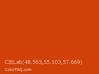 CIELab 48.563,55.103,57.669 Color is a normal orange color and the nearest color is Sinopia #cb410b. Hex code #d14009 and RGB value is rgb(209,64,9). In RGB color space, this color is composed of 82% red, 25% green, 4% blue, In CMYK color space, this color is composed of 0% cyan, 69% magenta, 96% yellow , 18% black , In HSL color space, this color has a hue angle of 17° , 92% saturation and 43% lightness.