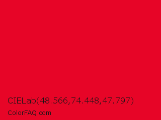 CIELab 48.566,74.448,47.797 Color is a normal red color and the nearest color is Spanish Red #e60026. Hex code #e70527 and RGB value is rgb(231,5,39). In RGB color space, this color is composed of 91% red, 2% green, 15% blue, In CMYK color space, this color is composed of 0% cyan, 98% magenta, 83% yellow , 9% black , In HSL color space, this color has a hue angle of 351° , 96% saturation and 46% lightness.