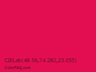 CIELab 48.56,74.282,23.055 Color is a normal rose color and the nearest color is Razzmatazz Crayola #e30b5c. Hex code #e30e51 and RGB value is rgb(227,14,81). In RGB color space, this color is composed of 89% red, 5% green, 32% blue, In CMYK color space, this color is composed of 0% cyan, 94% magenta, 64% yellow , 11% black , In HSL color space, this color has a hue angle of 341° , 88% saturation and 47% lightness.