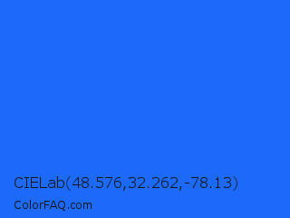 CIELab 48.576,32.262,-78.13 Color is a normal blue color and the nearest color is Blue Crayola #1f75fe. Hex code #1c69fa and RGB value is rgb(28,105,250). In RGB color space, this color is composed of 11% red, 41% green, 98% blue, In CMYK color space, this color is composed of 89% cyan, 58% magenta, 0% yellow , 2% black , In HSL color space, this color has a hue angle of 219° , 96% saturation and 55% lightness.