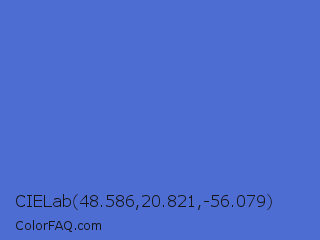 CIELab 48.586,20.821,-56.079 Color is a normal blue color and the nearest color is Han Blue #446ccf. Hex code #4e6dd3 and RGB value is rgb(78,109,211). In RGB color space, this color is composed of 31% red, 43% green, 83% blue, In CMYK color space, this color is composed of 63% cyan, 48% magenta, 0% yellow , 17% black , In HSL color space, this color has a hue angle of 226° , 60% saturation and 57% lightness.