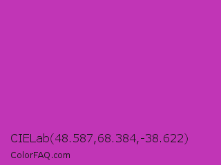 CIELab 48.587,68.384,-38.622 Color is a normal magenta color and the nearest color is Byzantine #bd33a4. Hex code #c135b6 and RGB value is rgb(193,53,182). In RGB color space, this color is composed of 76% red, 21% green, 71% blue, In CMYK color space, this color is composed of 0% cyan, 73% magenta, 6% yellow , 24% black , In HSL color space, this color has a hue angle of 305° , 57% saturation and 48% lightness.