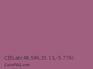CIELab 48.596,31.13,-5.779 Color is a normal rose color and the nearest color is Tapestry #b05e81. Hex code #a15f7e and RGB value is rgb(161,95,126). In RGB color space, this color is composed of 63% red, 37% green, 49% blue, In CMYK color space, this color is composed of 0% cyan, 41% magenta, 22% yellow , 37% black , In HSL color space, this color has a hue angle of 332° , 26% saturation and 50% lightness.