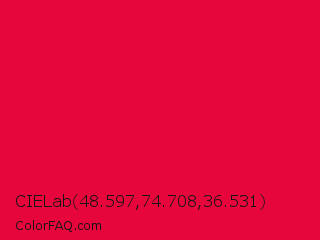 CIELab 48.597,74.708,36.531 Color is a normal red color and the nearest color is Red Ribbon #ed0a3f. Hex code #e6063b and RGB value is rgb(230,6,59). In RGB color space, this color is composed of 90% red, 2% green, 23% blue, In CMYK color space, this color is composed of 0% cyan, 97% magenta, 74% yellow , 10% black , In HSL color space, this color has a hue angle of 346° , 95% saturation and 46% lightness.