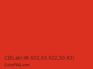 CIELab 48.602,63.922,50.83 Color is a normal red color and the nearest color is Vermilion #d9381e. Hex code #db301f and RGB value is rgb(219,48,31). In RGB color space, this color is composed of 86% red, 19% green, 12% blue, In CMYK color space, this color is composed of 0% cyan, 78% magenta, 86% yellow , 14% black , In HSL color space, this color has a hue angle of 5° , 75% saturation and 49% lightness.