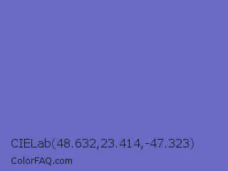 CIELab 48.632,23.414,-47.323 Color is a normal blue color and the nearest color is Toolbox #746cc0. Hex code #696ac4 and RGB value is rgb(105,106,196). In RGB color space, this color is composed of 41% red, 42% green, 77% blue, In CMYK color space, this color is composed of 46% cyan, 46% magenta, 0% yellow , 23% black , In HSL color space, this color has a hue angle of 239° , 44% saturation and 59% lightness.