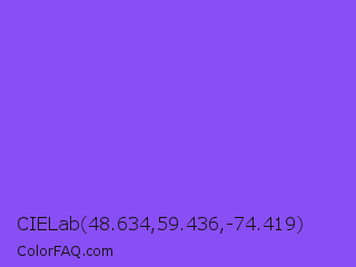 CIELab 48.634,59.436,-74.419 Color is a light violet color and the nearest color is Navy Purple #9457eb. Hex code #894ef4 and RGB value is rgb(137,78,244). In RGB color space, this color is composed of 54% red, 31% green, 96% blue, In CMYK color space, this color is composed of 44% cyan, 68% magenta, 0% yellow , 4% black , In HSL color space, this color has a hue angle of 261° , 88% saturation and 63% lightness.
