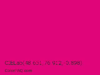 CIELab 48.651,76.912,-0.898 Color is a normal rose color and the nearest color is Red Purple #e40078. Hex code #e00578 and RGB value is rgb(224,5,120). In RGB color space, this color is composed of 88% red, 2% green, 47% blue, In CMYK color space, this color is composed of 0% cyan, 98% magenta, 46% yellow , 12% black , In HSL color space, this color has a hue angle of 328° , 96% saturation and 45% lightness.