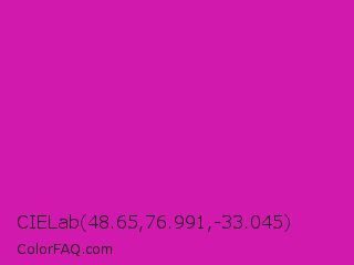 CIELab 48.65,76.991,-33.045 Color is a normal magenta color and the nearest color is Royal Fuchsia #ca2c92. Hex code #d11aad and RGB value is rgb(209,26,173). In RGB color space, this color is composed of 82% red, 10% green, 68% blue, In CMYK color space, this color is composed of 0% cyan, 88% magenta, 17% yellow , 18% black , In HSL color space, this color has a hue angle of 312° , 78% saturation and 46% lightness.