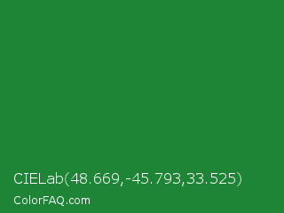 CIELab 48.669,-45.793,33.525 Color is a normal green color and the nearest color is Forest Green #228b22. Hex code #1e8537 and RGB value is rgb(30,133,55). In RGB color space, this color is composed of 12% red, 52% green, 22% blue, In CMYK color space, this color is composed of 77% cyan, 0% magenta, 59% yellow , 48% black , In HSL color space, this color has a hue angle of 135° , 63% saturation and 32% lightness.