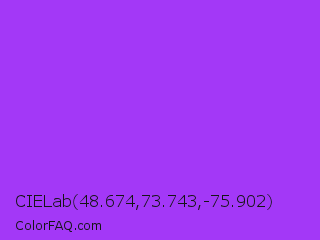 CIELab 48.674,73.743,-75.902 Color is a normal purple color and the nearest color is Veronica #a020f0. Hex code #a338f7 and RGB value is rgb(163,56,247). In RGB color space, this color is composed of 64% red, 22% green, 97% blue, In CMYK color space, this color is composed of 34% cyan, 77% magenta, 0% yellow , 3% black , In HSL color space, this color has a hue angle of 274° , 92% saturation and 59% lightness.