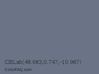CIELab 48.683,0.747,-10.987 Color is a normal blue color and the nearest color is Pale Sky #6e7783. Hex code #6b7486 and RGB value is rgb(107,116,134). In RGB color space, this color is composed of 42% red, 45% green, 53% blue, In CMYK color space, this color is composed of 20% cyan, 13% magenta, 0% yellow , 47% black , In HSL color space, this color has a hue angle of 220° , 11% saturation and 47% lightness.