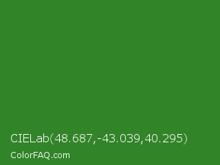 CIELab 48.687,-43.039,40.295 Color is a normal green color and the nearest color is Forest Green #228b22. Hex code #328429 and RGB value is rgb(50,132,41). In RGB color space, this color is composed of 20% red, 52% green, 16% blue, In CMYK color space, this color is composed of 62% cyan, 0% magenta, 69% yellow , 48% black , In HSL color space, this color has a hue angle of 114° , 53% saturation and 34% lightness.