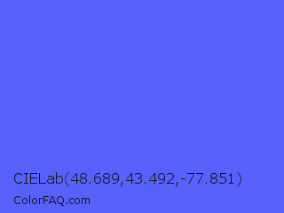 CIELab 48.689,43.492,-77.851 Color is a light blue color and the nearest color is Very Light Blue #6666ff. Hex code #5860fa and RGB value is rgb(88,96,250). In RGB color space, this color is composed of 35% red, 38% green, 98% blue, In CMYK color space, this color is composed of 65% cyan, 62% magenta, 0% yellow , 2% black , In HSL color space, this color has a hue angle of 237° , 94% saturation and 66% lightness.